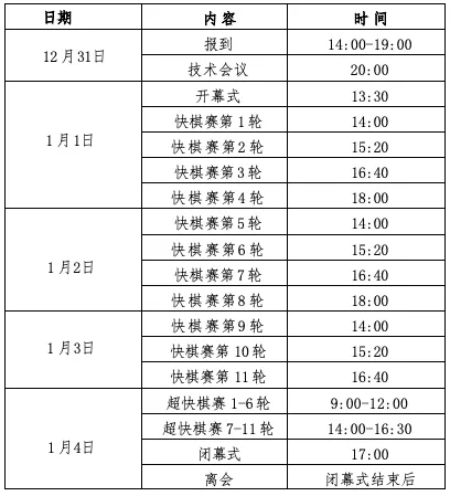 比赛设快棋、超快棋两个项目,各进行11轮的比拼。快棋赛为每方15分钟,每步棋加10秒;超快棋赛是每方3分钟,每步棋加2秒。