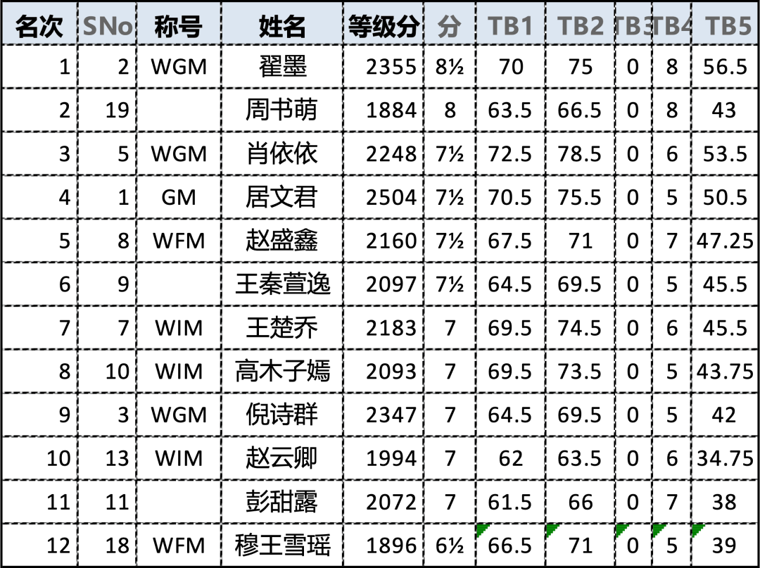 肖依依、居文君、赵盛鑫、王秦萱逸四位棋手积分相同,经过破同分,肖依依跻身前三名。