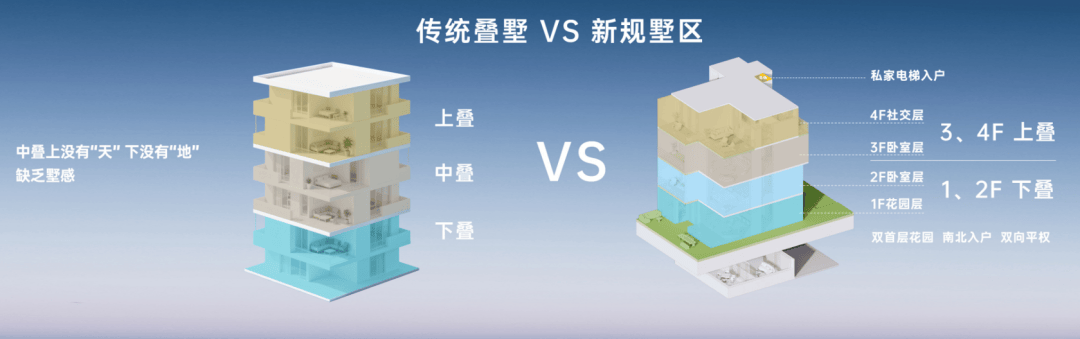 而摒弃中叠,只有纯上下叠的叠拼产品,实际使用面积也远超常规三叠。建面约169-178㎡的叠拼,不含花园得房率最高可达220%。上叠产品还颠覆性地解决了传统“无院无地”的痛点——设置了专属入户花园。