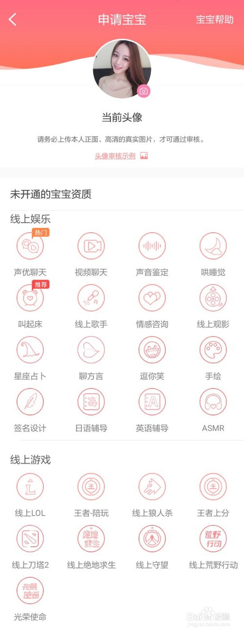 3.如图所示,进到列表里后可以更改头像,也可以看到四大类,分别是线上娱乐、线上游戏,线下娱乐与线下游戏,每一个大类下又包含声优聊天,视频聊天,叫起床,哄睡觉等若干个小类,可根据自己擅长的项目点击申请。